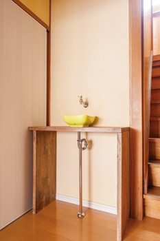 | 2階と雰囲気を変えた3階のトイレは、ビビッドカラーが目を引く空間。 | 3階廊下にあった洗面台は取り替え、新たに造作してオシャレに。 |