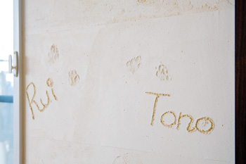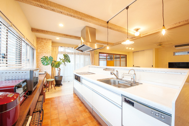 | LDKと子ども部屋は漆喰壁。手形を押したペットたちのニオイもほとんど感じられない。 | 以前からあったキッチンの位置を変えて対面型にし、家族との一体感を創出。薄い色合いの化粧梁がLDKの良いアクセントに。 |