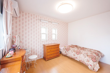 | キッチンのリビング側には、天板の縁をモールと似たあしらいにこだわった造作カウンターを設置 | 壁の一面のみキュートなアクセントクロスを貼って空間にメリハリをつけた娘さんの部屋。もともとは和室だった。インテリアの統一感も取れている |
