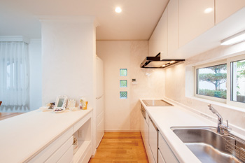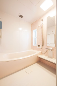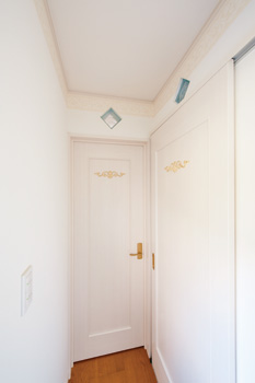 | 天井近くの壁にはガラスブロック、娘さんの部屋のドアにも装飾を施すなどこだわり満載 | 1坪サイズに広げた浴室でゆったり入浴 |