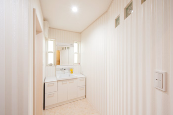 | 洗面台を取り替え、新たに設けた洗面脱衣室は使いやすさ抜群 | 奧に付けた便利な収納棚にはマンガも |