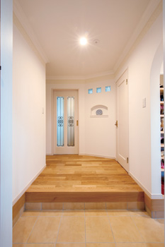 | ロールスクリーンで隠せるシューズクロークは増築の産物 | ガラスブロックやニッチを付けた玄関内。広さと明るさもアップ |