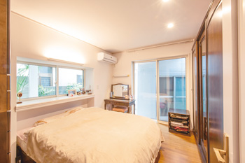 | 奥行きを増し、軒天井も新しくした玄関。重厚感あるドアからもヨーロピアンテイストが漂い、雰囲気と開放感も◎。縦スリットのガラスはシューズクロークの明かりとり | LDKに比べるとこちらはシンプルな内装に仕上げた寝室。横長の窓と掃き出し窓で明るい空間になっている |