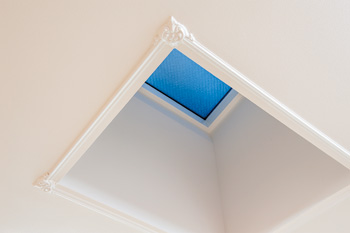 | 日中は、外出時に照明を消し忘れたと勘違いするほどの明るさをLDKにもたらしてくれる天窓 | リビング中央部の壁のみアクセントクロスを貼り、空間にアクセントを加えたLDK。白い内装にナラの無垢フローリングが映える |