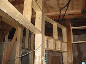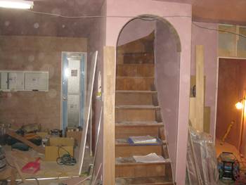 | 玄関の正面に、ニッチとガラスブロックの下地を大工さんが作ります。 | 階段への壁にはアールの細工 |