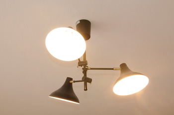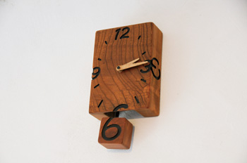 | リビングのこの照明をはじめ、ダイニングや廊下、玄関などの照明をネットで調達。レトロ風でありつつモダンな雰囲気をもつものを選んだという。 | LDKの壁に飾る時計を随分悩んでいた奥さまは、あるイベントで一枚板の時計を発見。それほど大きくはないが、くっきりと刻まれた年輪や色合いで充分すぎるほどの存在感を示している。 |