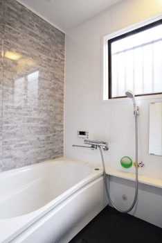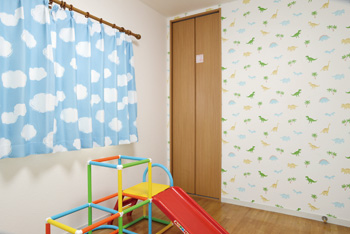 | 子ども部屋の壁は一面のみ柄入りクロスを貼り、青空を思わせるカーテンを設置。これらはご主人のお父さまの手で施工されたもの。 | キッチンなどと同様、設備機器選びはほぼおまかせしたという浴室。TOTOの1218サイズのシステムバスに一新。 |