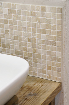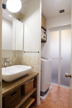 | 足場板で造作したお気に入りの洗面台をモザイクタイルで取り囲み、アイアン製のタオルハンガーを取り付けてオシャレ感を増した洗面脱衣室。 | 洗面台周りのモザイクタイルは、色や雰囲気などのイメージをコーディネーターにしっかり伝えた上でセレクト。 |