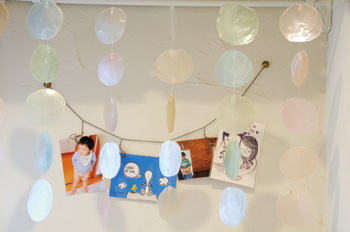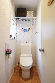 | 限られた空間のため、洗面脱衣室とともに珪藻土壁塗りには苦労したというトイレ。細かい部分の塗装には、バターを塗るヘラを使うなどして工夫したそうだ。 | トイレにも奥さまの素敵な工夫が。紐に息子さんの写真やお気に入りのカードなどを吊したりクリップで挟むなどして、楽しげな雰囲気を醸し出している。 |