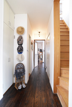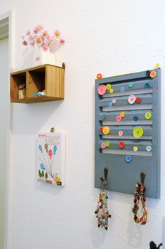 | 玄関からLDKへとつながる廊下は床材をLDKと同じにし、深みのある飴色と木目が重厚感を演出。わずかな壁面も帽子掛けとして有効活用。 | カラフルなボタンや木製の箱などを活用して廊下の白い壁面に彩りを添えた、奥さまのオリジナルデコレーション。 |