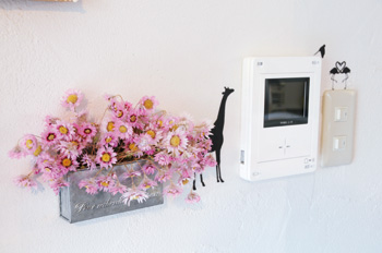 | ダイニングには、奥さまが五日市店で見てイメージが合致し、価格も想像より安かったというオリジナルの造作パントリーを造り付けた。 | 動物をモチーフにしたウォールステッカーやアートフラワーなどで、インターホンや照明スイッチの周りも素敵にデコレーション。これらはすべて奥さまの手によるもの。 |