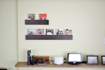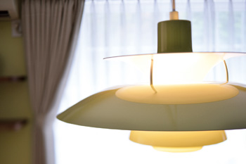 | ダイニングスペースには奥様憧れのルイス・ポールセンの照明。壁の色に合わせて選んだ | インテリア的なアクセントにもなるCDのディスプレイ棚はご主人が取り付けたもの |