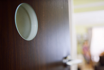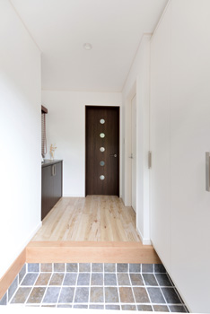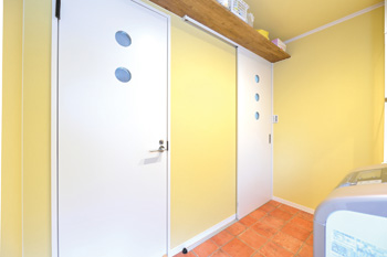 | 名古屋モザイクの土間タイルが印象的な玄関。右手のドアから洗面脱衣室と浴室に直行でき、子どもたちが泥んこになって帰ってきても大丈夫 | ドアごとに数の違う丸がデザインされた建具 |