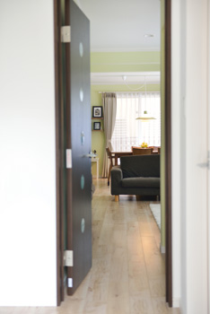 | 照明の消し忘れ防止を兼ね、ドアには奥様が使いたかったガラスブロックをはめ込んだ | 玄関とLD両方から出入りできるよう、洗面脱衣室の出入口は2つ |