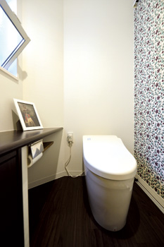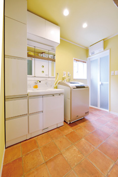 | 明るさと広さを増し、タイル風クッションフロアを敷いた洗面脱衣室 | トイレは向きを変えて広さが倍増。アクセントクロスが効いている |