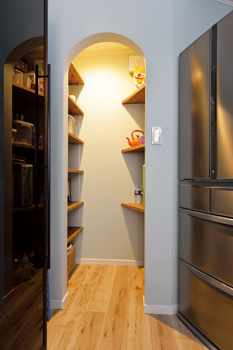 | リビングとつながるキッチンの壁には、ご主人も気に入っているという大胆な柄入りのクロスを貼り、インパクトある空間に。システムキッチンは既存のまま活用した | 小さかった収納空間を広げたパントリー。壁をアール仕上げにして優しい印象に |