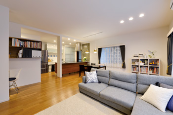LDKを全面リフォーム。リビングとキッチンの間の垂れ壁をなくし、大きめのシステムキッチンを入れて明るく開放的なキッチンに。クローゼットの半分をパソコンコーナーにし、造作書棚とカウンターを配置。フローリングを張り替え、回り縁をなくすなどして明るいリビング空間を実現。