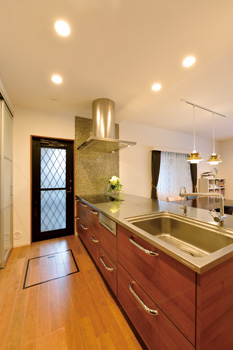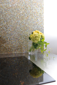 | 「子どもと一緒に料理ができるように」とシステムキッチンは大きめを希望し、ステンレスと木目調の組み合わせが新鮮なTOYOキッチンを設置。下が浮いているのも決め手の一つ | TOYOキッチンのショールームにあったベネチアンタイルは、ルイス・ポールセンの照明とも雰囲気がぴったり |
