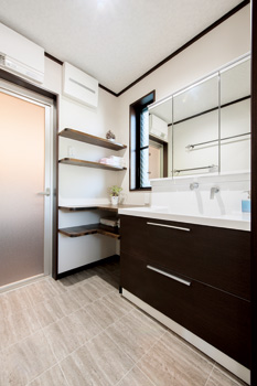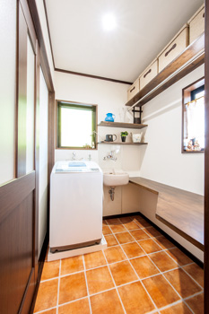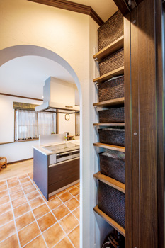 | LDKの窓側にアイランドキッチン。ショールームを多く回り、妥協せず上質の人工大理石を使ったトクラスのハイクオリティラインを選択 | パントリー入り口と洗面脱衣室の間には、掃除機を始め、食品のストック品等を収める可動棚を造作 |