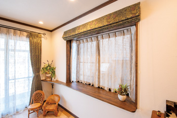 | 大空間に生まれ変わったリビングは天井の間接照明が印象的。パントリー入口の斜めの壁をアール仕上げにすることで、リビングから冷蔵庫が目立たない工夫もv | 出窓のカーテンは、キッチンのペンダントライトの雰囲気に合わせてウィリアム・モリスに。ここにも妥協なし |