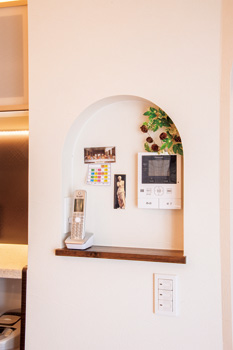 | キッチンカウンター横、可動棚の裏側の壁も飾り棚としてフル活用 | インターホンが目立たないよう、アール仕上げのニッチで電話機も置けるよう工夫 |