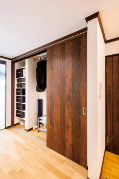 | 木の温もりが伝わる空間になった玄関。正面のトイレは、引き戸を開けたままでもまるで一つの部屋のよう | LIXILのショールームで吟味した上で選んだ、温もりある玄関ドア |