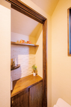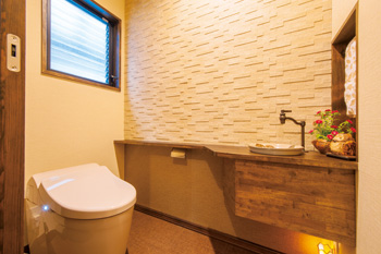 | 家事がしやすいよう工夫したパントリー。棚の下には室内干しなどに使うハンガーパイプ | 壁にデザイン性の高いエコカラットをあしらい、向きを変えて広くなったトイレは収納力も抜群。節水型にしたことで、水道代もかなり抑えられた |