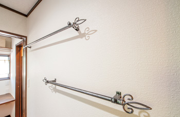 | 狭かった洗面脱衣室は、洗濯機をパントリーに移動して使いやすく | LDKと同じカーテンレールを段違いにあしらい、タオル掛けとして活用 |
