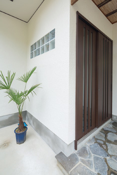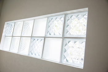 | 3種類のガラスブロックを組み合わせた明かり取り。組み合わせ方はコーディネーターが考案 | ガラスブロックで外部からの視線を遮りつつも明るさを確保 |