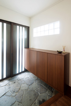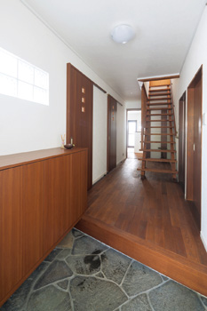 | 床とマッチするよう架け替えた階段を含め、和モダンな雰囲気が漂う | ドアからも外光が入る玄関。たたきは既存のままで玄関収納を新設 |