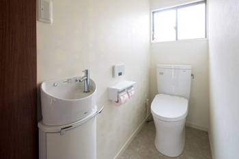 | 床の間のある和室は、壁クロスと入口の建具、畳を一新し、広縁の床を貼り替えた | 以前よりもシンプルに、やや広くなったトイレ。1面のみうっすらと柄が入った壁クロスを貼っている |