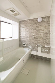 | 以前よりも浴槽が広くなり、ゆったり入浴できるように | すべてを一新した洗面脱衣室。壁クロスはトイレの柄と統一 |
