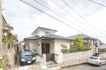 | 経年劣化し、やや暗い色合いになっていた外壁は以前よりも明るい色に塗り直し、屋根瓦は新しく葺き替えた。古いカーポートも撤去 | 石造りの玄関階段はそのまま残し、ブロックを積み上げて作られていた門柱を撤去。明るい白塗りの門塀に一新した |