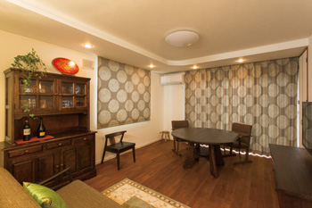 | ダウンライトを仕込んだ折り上げ天井は既存のまま活用。お二人が気に入って購入したカーテンを閉めるとムーディーな雰囲気に | 新婚当時の収納家具を塗装し直して使ったり、奥様のハンドメイド作品が飾られるなど、ご夫婦の思い出が息づくリビング |