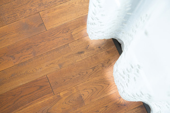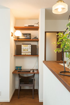 | かつてのリビングの出入口を塞いでできた空間をパソコンコーナーとして有効活用 | ご夫婦が「懐かしい色」と称する床には、隣の洋室や廊下とともに、栗皮茶などナチュラル塗装したナラの無垢材を採用 |