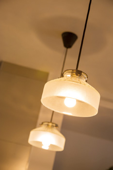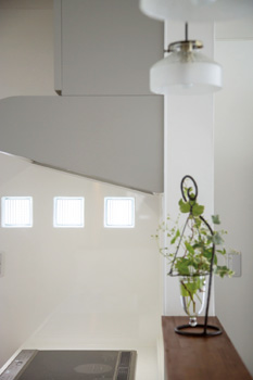 | キッチン上に吊り下げられた昭和レトロ風の照明は奥様が即決して購入 | キッチン横の壁には、明かり取りのガラスブロックを埋め込んでいる |