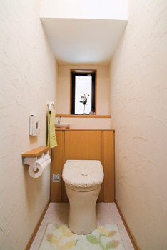 | 窓際に収納スペースを備えたトイレ。 | 珪藻土を塗った浴室は吸湿効果で窓ガラスの曇りが無くなった。 |