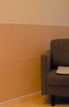 LDの床や引き戸に無垢のパイン材を、腰壁に特殊なタイルを