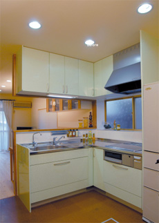 | キッチン IH仕様のL型システムキッチンを配した、シンプルな対面式キッチン。吊り戸と床下収納庫も便利 |