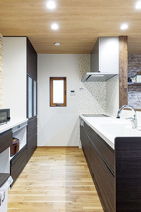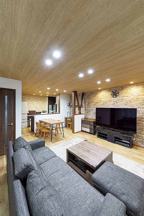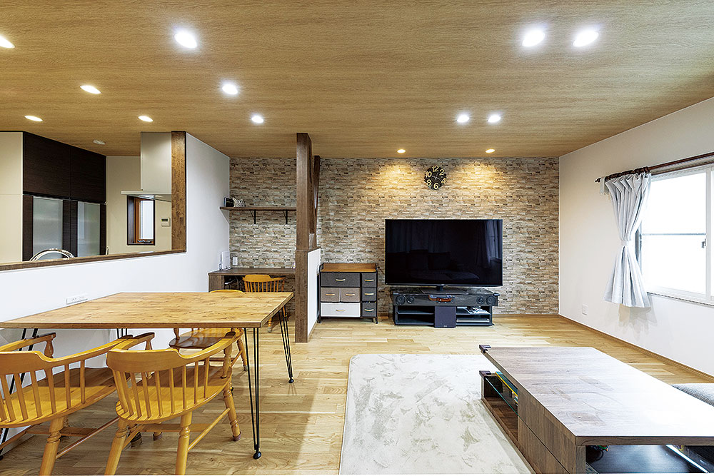 とはいえ、リフォームを機にきれいな家に住みたいという憧れもあり、家族が集まるLDKは元のダイニングキッチンとリビングの壁を取り払い、使いやすい洋室に一新。家族が心地良く過ごせる明るい空間にするため、ライトカラーの床を採用し、ナチュラルテイストが好きだというご主人の意向で天井も木目調に。奥様がインスタグラムで見つけて気に入ったというレンガ調の壁も取り入れ、古さを感じさせないモダンな空間にした。
