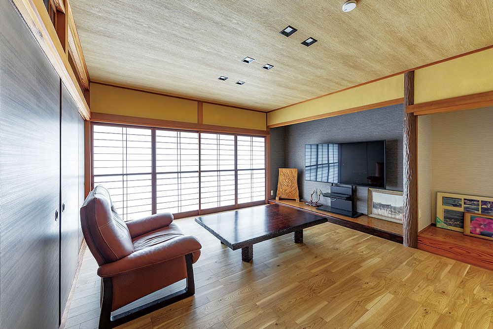 8帖の和室は床をフローリングにし、天井は木目調に。床の間の趣は残しつつ、テレビを置いて背後にグレーのアクセントクロスを張り、間接照明を設けた。柱は濃い色に塗り直して全体のトーンを合わせた。左手の襖も金混じりの黒っぽいモダンなデザインに