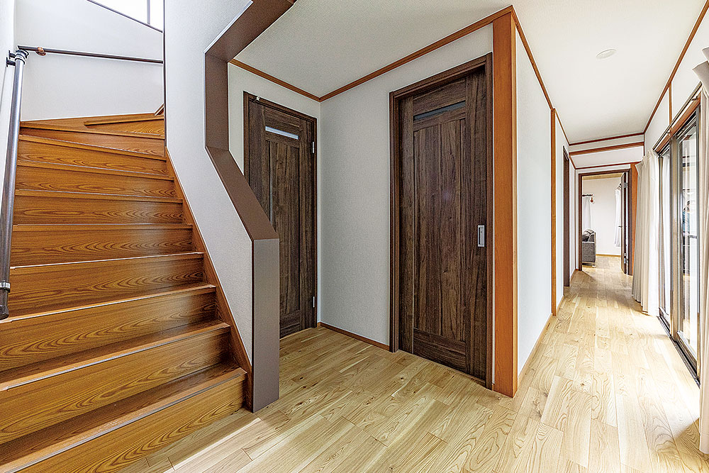 階段は既存のものを生かしながら、表面をきれいに。廊下も含めて全面リフォームしているが、間取りはLDK以外ほぼ変えずに残している