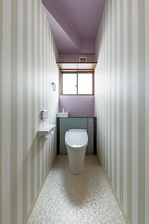 トイレはストライプ×パープルのクロスで華やかに。奥様の好きな色や柄でコーディネートしたお気に入りの空間。手洗いも新たに設置した
