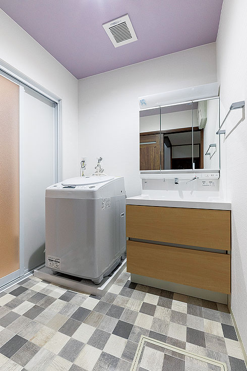 奥様のお気に入りは、壁紙に遊び心を加えたトイレや洗面室。「洗面室の床はタイル調にして、紫の天井に合わせた色にしました。入るたびにかわいいと思えるので、生活が楽しくなりましたね」と、うれしそうだ。本当はかわいらしいものが好みだという奥様は、LDKは家族のことを考えてシンプルにした分、よりプライベートな空間である水回りには好みを存分に反映させている。