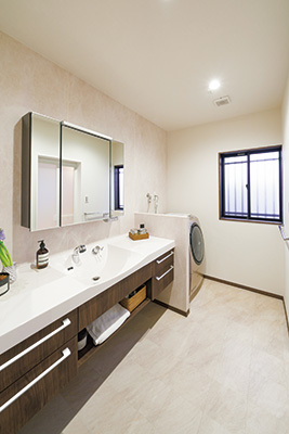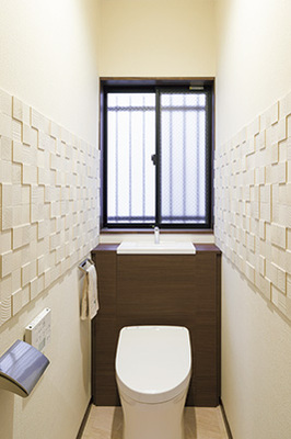 | ホテルを思わせる大型の洗面化粧台を新たに設置。ランドリースペースも兼ねたゆとりの空間が誕生した。 | ダイニングにあったトイレは、家族や来客が気兼ねなく使えるように洗面室側に移動。吸湿効果に優れたエコカラットを張った。 |