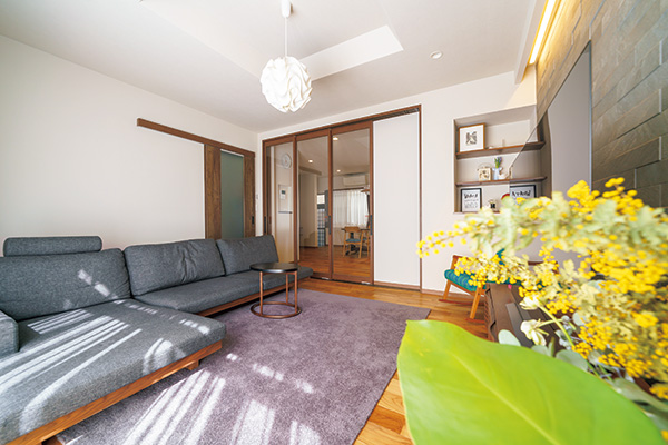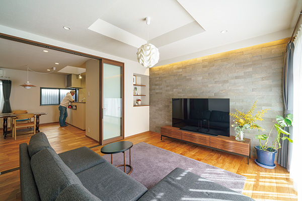 明るく開放的なLDKは3枚引き戸で仕切ることも可能。壁一面のエコカラットは、吸湿性能と同時に空間のアクセントにもなる。テレビをソファでくつろぎながら楽しめるようになり、ご夫婦にとってもお気に入りの場所。広さだけでなく新しい空間のつながりが、これからの暮らしを弾ませる。