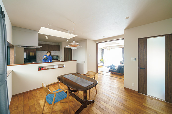 | 以前はご主人のお母様が過ごしていた洋室をLDKに取り込み、3枚引き戸を仕切りに設けて引き戸を閉めれば独立できる空間へ再生。床には無垢の温かみを感じるチーク材を採用。 | 奥様が使いやすく家事の負担が少ない空間へと生まれ変わったキッチン。ダイニングもリビングのようにゆったりくつろげる。広くなったLDKは引き戸で仕切ればリビングが独立。シンプルな内装は「物を外へ出したくない」という奥様の希望に応えたもの。 |