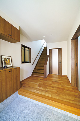 | 壁付きだったキッチンがオープンな対面キッチンへ変身。広くなった視界の先には造作のテレビ台。明るい天窓が吹き抜け感を演出している。ダイニング側からキッチン内を隠すカウンターも好評。 | 玄関は廊下をなくしホールのみに。床は無垢のチーク。ダイニングとリビングへの動線も最短にした。 |