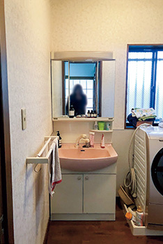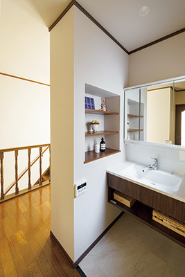| 2階の洗面台が丸見えだったのも奥様の不満。仕切り壁が目隠しになるよう場所を変えて洗面台を設置。ニッチも設けた。 |