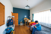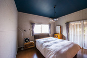 | 壁はコンクリート調、天井は暗めの色合いのクロスを選んだ寝室。落ち着いて就寝できる雰囲気 | 娘さんと息子さんが過ごす子ども部屋。一面のみ採用したアクセントクロスが空間を引き締めている |